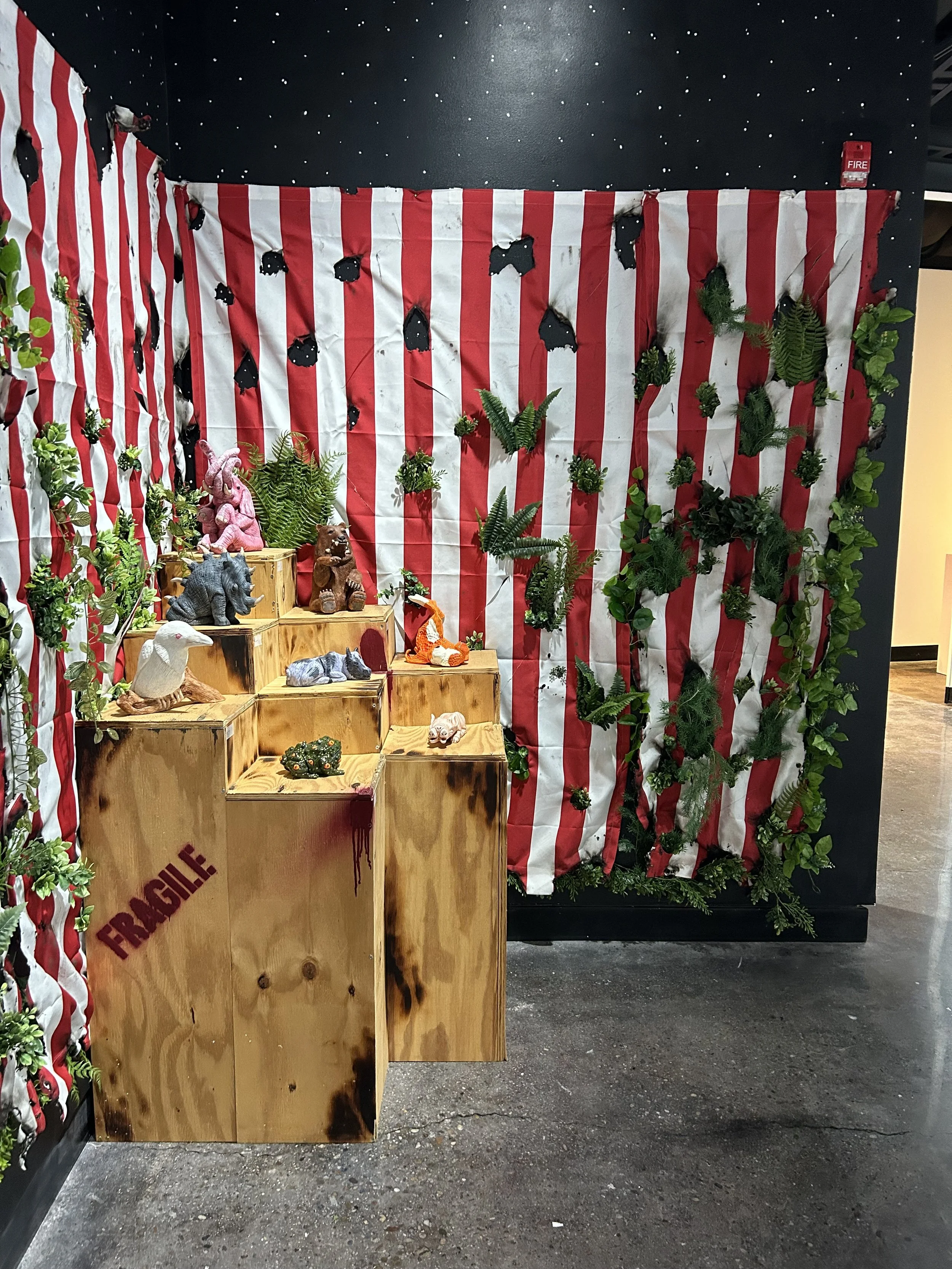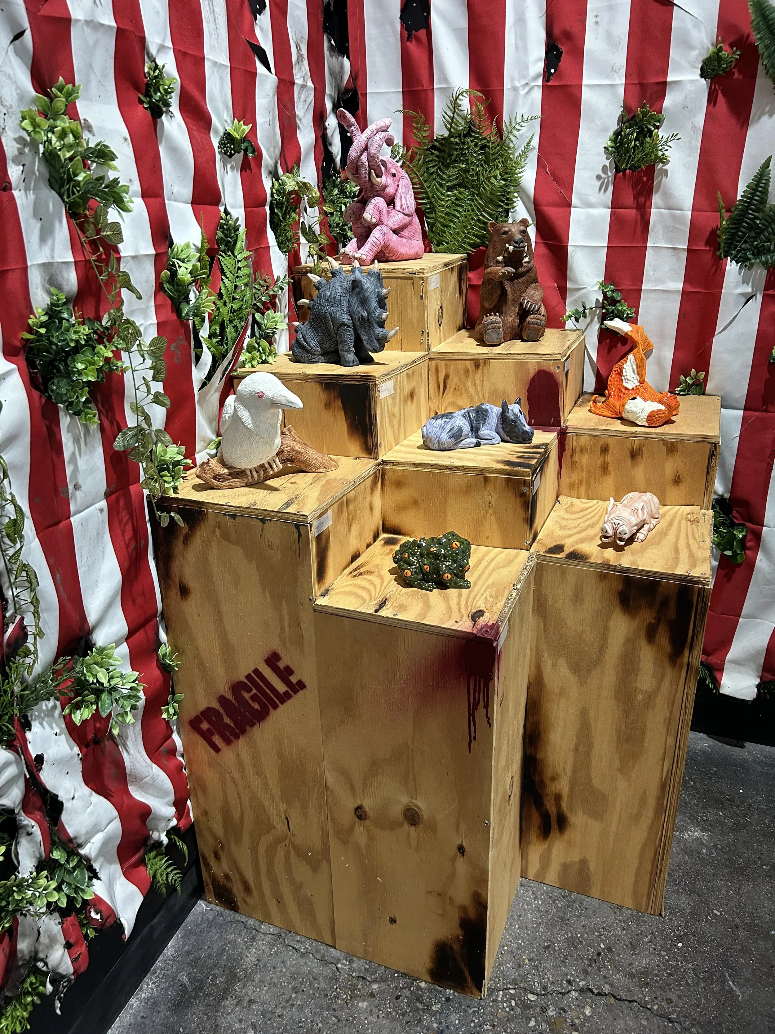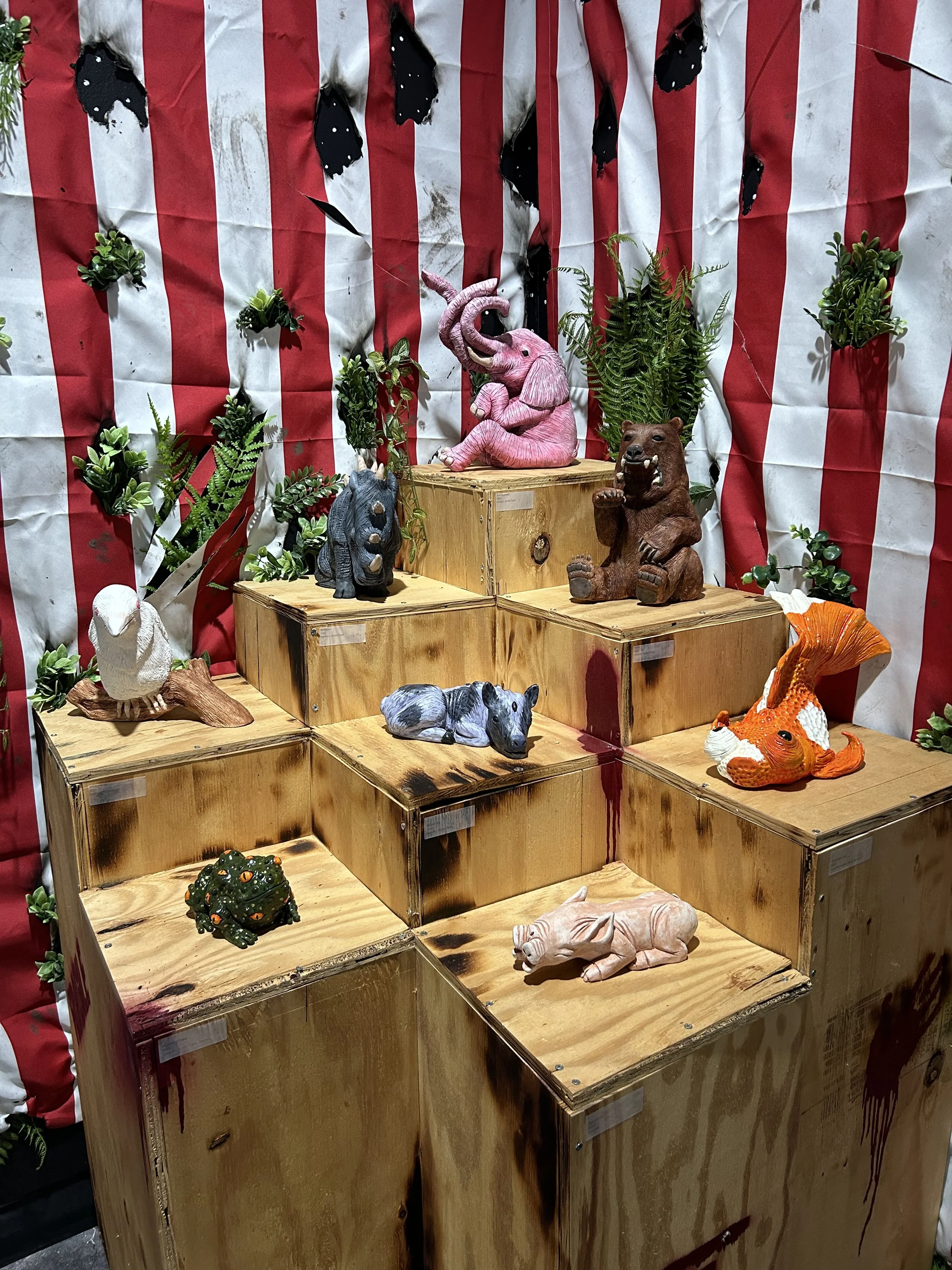 “Mutation” consists of 8 animals with various forms of mutations which ostracize them from others within their species. Using environmental storytelling, I illustrate their entrapment into the traveling circus and their eventual uprising resulting in violence and carnage, which sets them free to live their lives the way they want. The mutations serve as a metaphor for the otherness people may feel through experiences of being queer. Still, they can also fit the narrative of experiences with disability, race, or ethnicity. Many people find that others try to force them to be a certain way to be accepted by the world, whether it be to dress, act, speak, or look a certain way, which ultimately eliminates much of the individual’s identity. Transporting the viewer into my work’s narrative is vital to the impact I’d like my work to have on people, and I hope they resonate with the messages and characters that I create. By embracing chaos and unpalatability, they prove that one does not need to fit into a commercialized box of what society deems acceptable to live and succeed in this world. I encourage the viewer to identify with and join my animals in their fight for personal autonomy.